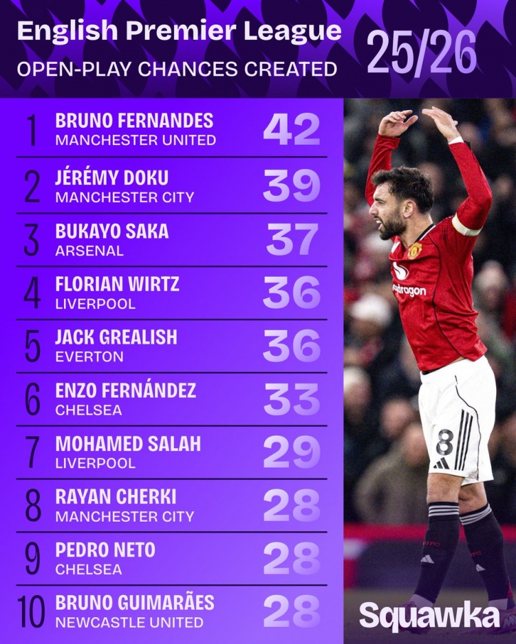 1月27日讯 Squawka统计本赛季至今英超球员运动战创造机会次数,B费42次居首,多库39次第二,萨卡37次第三。本赛季英超运动战创造机会次数1、B费(曼联):42次2、多库(曼城):39次3、萨卡(阿森纳):37次4、维尔茨(利物浦):36次格拉利什(埃弗顿):36次6、恩佐(切尔西...